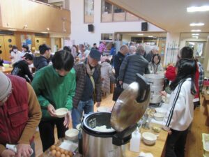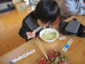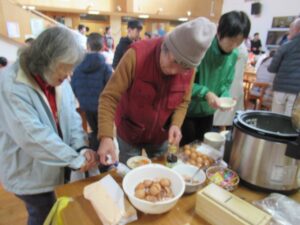 12月のこども食堂は鶏ラーメンと豆腐シュウマイ、卵かけご飯にごはんのお供でした。今回は地域の方もご利用いただき、スタッフは大忙し。