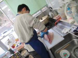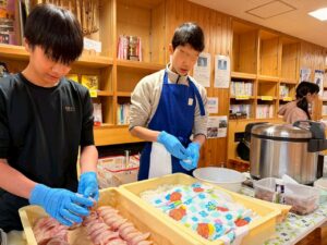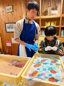 朝早くから中学生が手伝いに来てくれてさばきます。  きれいな刺身に。   2人が握り担当。  小学生も握りを教えてもらいます。